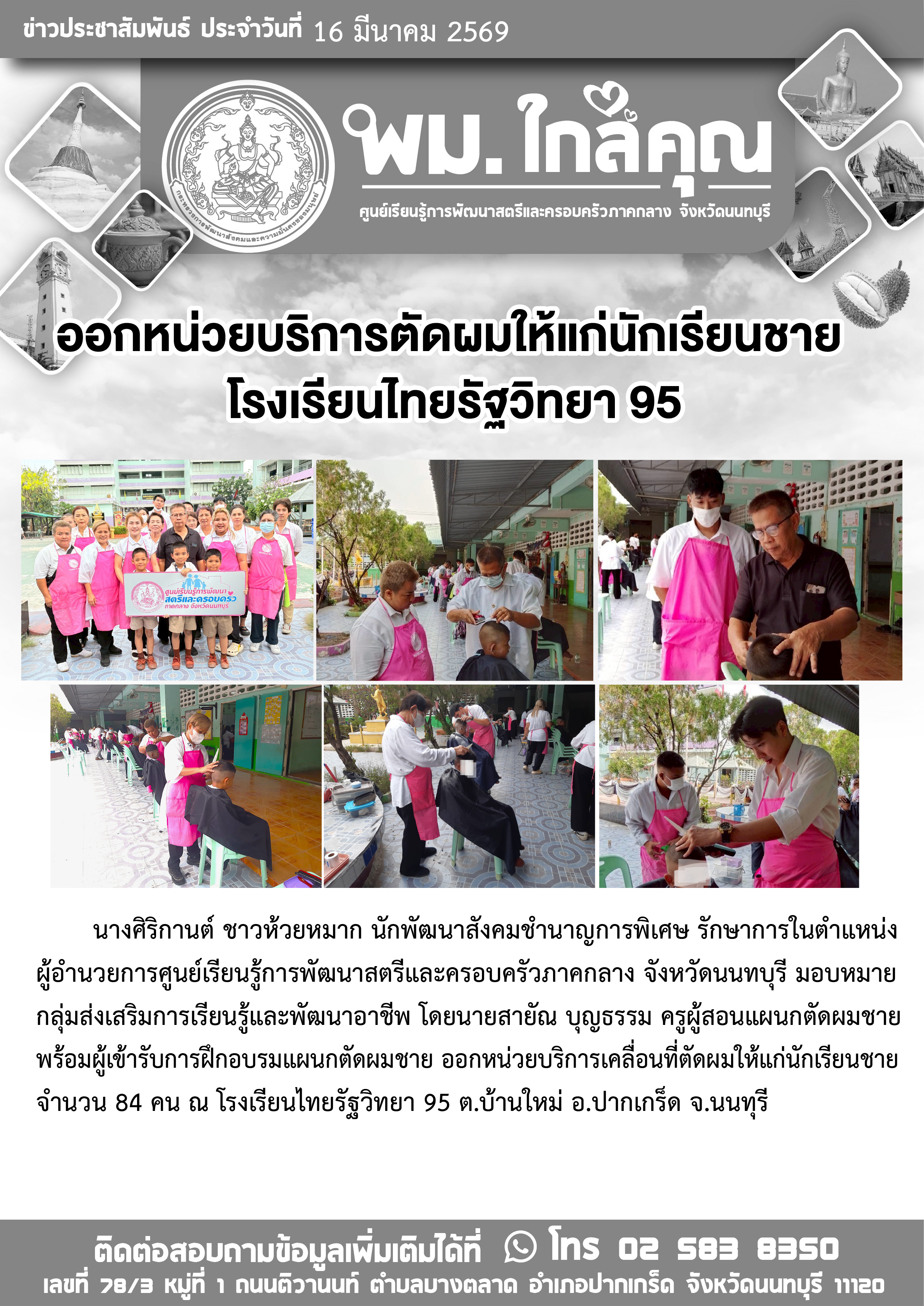 วันที่ 16 มีนาคม 2569 นางศิริกานต์ ชาวห้วยหมาก นักพัฒนาสังคมชำนาญการพิเศษ รักษาการในตำแหน่งผู้อำนวยการศูนย์เรียนรู้การพัฒนาสตรีและครอบครัวภาคกลาง จังหวัดนนทบุรี มอบหมายกลุ่มส่งเสริมการเรียนรู้และพัฒนาอาชีพ โดยนายสายัณ บุญธรรม ครูผู้สอนแผนกตัดผมชาย พร้อมผู้เข้ารับการฝึกอบรมแผนกตัดผมชาย ออกหน่วยบริการเคลื่อนที่ตัดผมให้แก่นักเรียนชาย จำนวน 84 คน ณ โรงเรียนไทยรัฐวิทยา 95 ต.บ้านใหม่ อ.ปากเกร็ด จ.นนทุรี