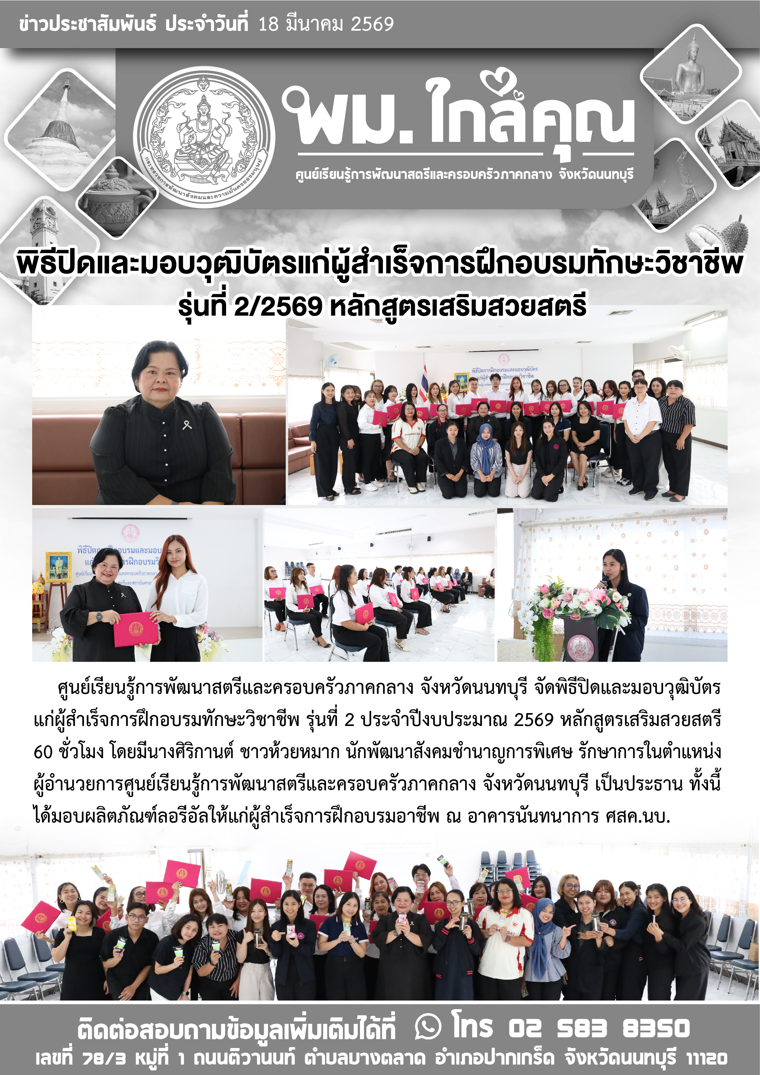 พิธีปิดและมอบวุฒิบัตรแก่ผู้สำเร็จการฝึกอบรมทักษะวิชาชีพ รุ่นที่ 2 ประจำปีงบประมาณ 2569 หลักสูตรเสริมสวยสตรี 60 ชั่วโมง